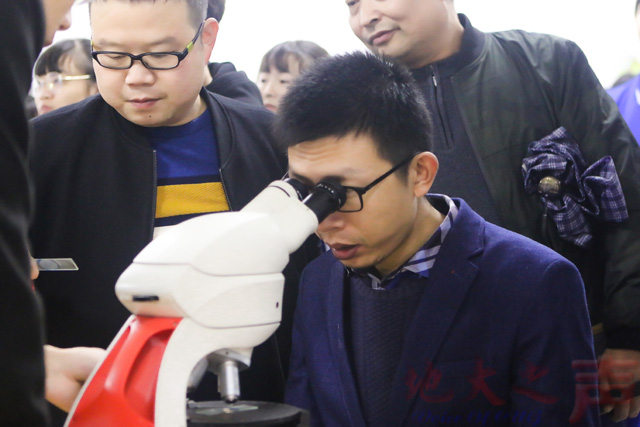 通过VR虚拟设备,师生们还体验了置身大冶铁矿开采现场的真实场景。在镜下观察展区,肉眼看起来颜色纯净质地均匀的岩石,通过显微镜显现出五彩斑斓的颜色和形态各异的构造。同学们直呼:太神奇了!