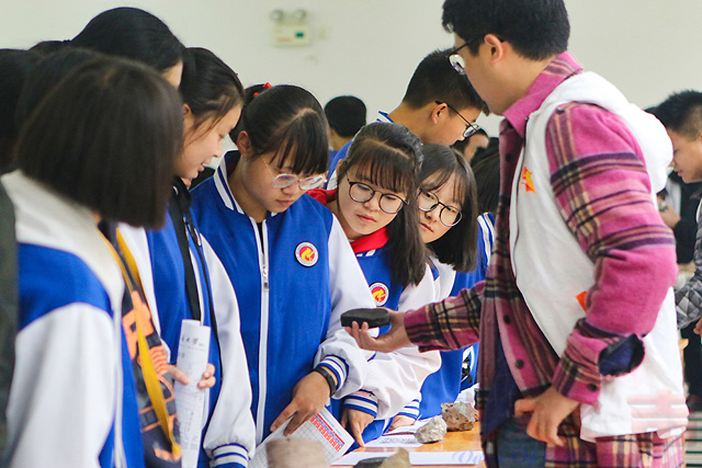 在志愿者的引导下,1200余名师生分批次参观了岩石园、地质灾害模型、矿石标本展、沉积岩标本展、地质风貌摄影作品展、精品矿物标本展、珠宝玉石展、恐龙模型展、地质年代阶梯等9个展位的展品。三维立体的恐龙模型、精美绝伦的珠宝矿物、趣味盎然的地质工作,看似平淡无奇却蕴含着科学奥秘的石头让同学们惊叹不已。