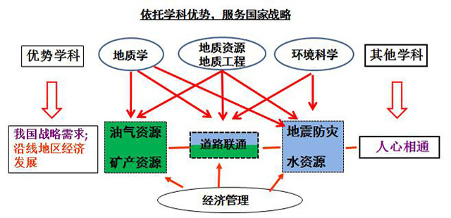 2014年11月,学校成立丝绸之路学院,核心目标意在服务国家“一带一路”倡议,围绕人才培养、协同创新中心、人文和学术交流三大任务,先后成立了“丝绸之路地质资源国际研究中心”“约旦研究中心”“土库曼斯坦研究中心”以及“中巴经济走廊研究中心”。 2017年6月, “约旦研究中心”和“土库曼研究中心”入选教育部国别和区域研究中心备案名单。以“丝绸之路学院”为依托,先后主办了两届“亚洲特提斯造山与成矿国际学术研讨会暨丝绸之路高等教育合作论坛”,搭建了“一带一路”科教交流合作的平台,为教育互联互通积累了广泛的人脉和信息资源。