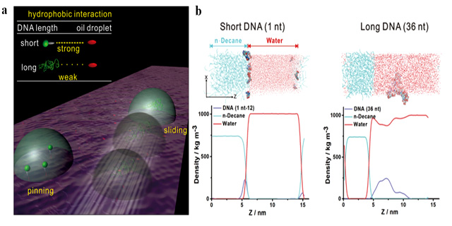 图1(a)基于超滑油凝胶界面上液滴运动的可视化检测示意图;(b)分子动力学模拟不同长度DNA对油性界面的疏水作用。