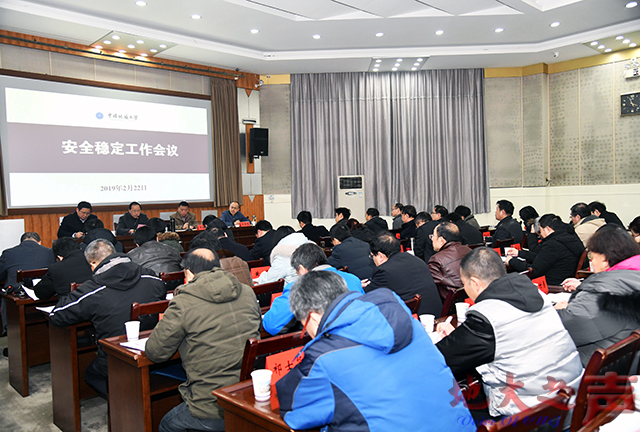 王林清传达了教育部党组、省委高校工委、省教育厅文件精神,对学校《关于切实维护安全稳定 全面提升“平安校园”建设水平的意见》主要内容进行解读,并从健全维护安全稳定工作责任制、建立维护学校稳定工作月志制度、做好2019年节假日值班工作等方面,布置2019年校园安全稳定相关工作。他强调,全校各单位要高度重视安全稳定工作,紧紧围绕新阶段办学目标,强化底线意识,深化“平安校园”建设,构建长效机制,营造“安全、有序、和谐、稳定”的育人环境。