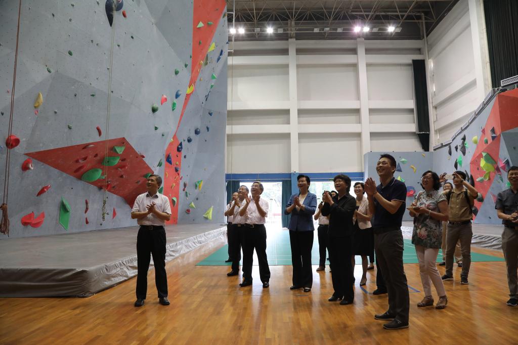 会前,翁铁慧一行实地调研了攀岩馆和地质过程与矿产资源国家重点实验室。在攀岩馆,翁铁慧一行听取了opta足球攀岩、游泳、羽毛球等特色体育工作的汇报,观看了opta足球攀岩训练。
