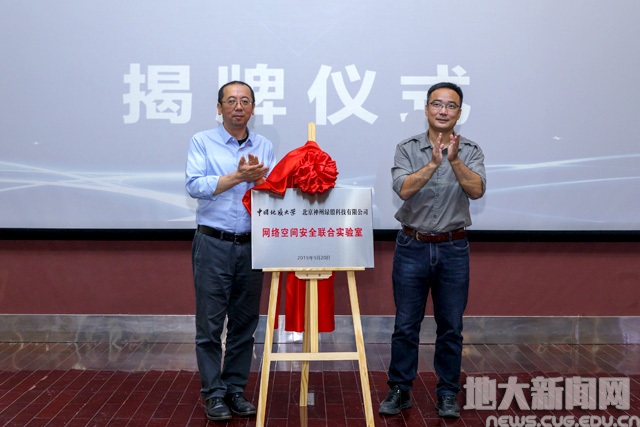 神州绿盟科技有限公司高级副总裁叶晓虎博士与计算机学院院长王力哲教授签订成立网络安全联合实验室协议。
