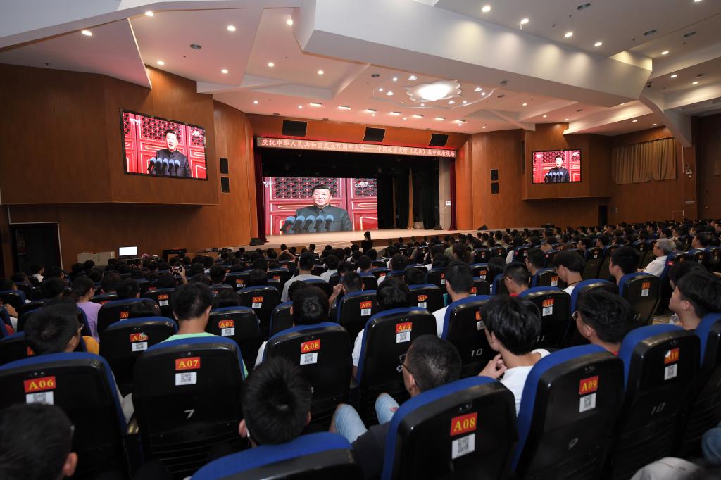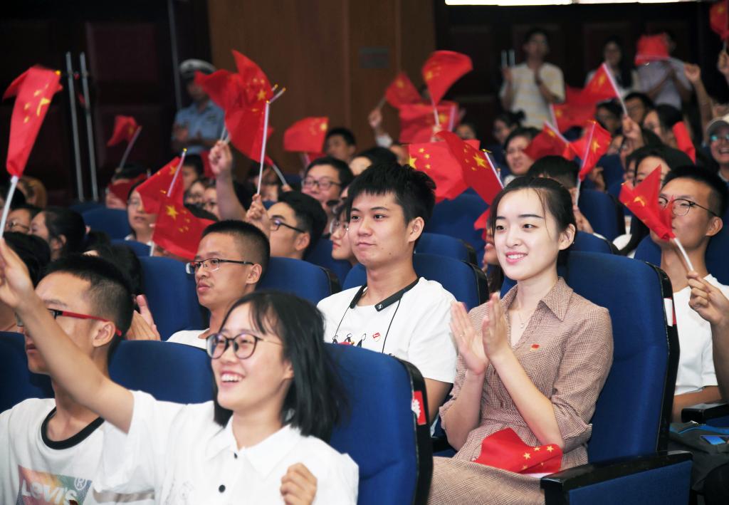 在南望山校区弘毅堂,师生们收看直播,倍感振奋,脸上洋溢着节日的笑容,激动人心的掌声在场内此起彼伏;在未来城校区,师生边收看直播,边挥舞手中的五星红旗,祝愿祖国繁荣昌盛。