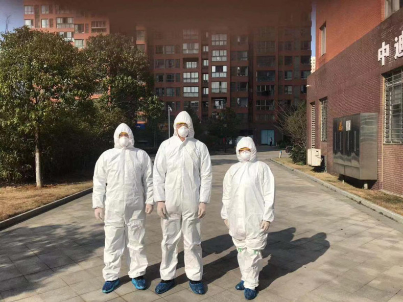 下午两点十分, 陈文武、彭冠军、刘毅赶到居委会,同党员社区服务小组韩小红、刘东杰碰头。在场同志没有犹豫和退缩,立即决定由陈文武、彭冠军、刘毅三人,穿上防护服、防护镜、医用手套,前往患者家里,接送他至校医院检查。