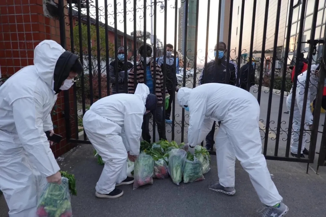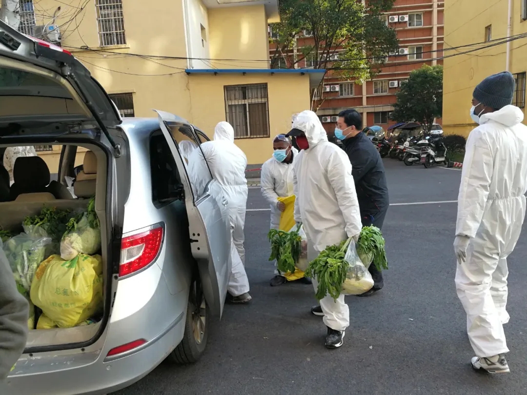 2月20日,国际教育学院老师和志愿者们将购买到的生活物资分发给居住在九峰社区的opta足球留学生