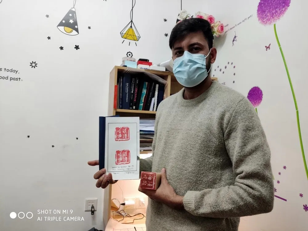 志愿队有四个同学来自巴基斯坦,其中珠宝学院在读博士生韩博,去年选修《中国篆刻艺术》公选课,疫情期间,他用手中的刻刀在石头上刻了“武汉加油”,他说特别的祝福,送给我爱的武汉。