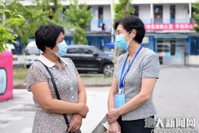 在前往新生宿舍的路上,校党委书记黄晓玫遇见新生家长,和家长亲切交流。