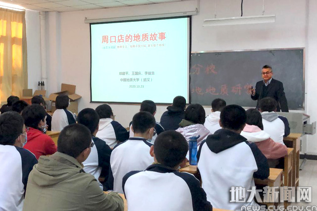 在开营仪式上,郑建平教授作题为“周口店的地质故事”的科普报告,他用生动翔实的素材、深入浅出的语言向四中的师生们述说了自然的神奇与美丽,以及地质学与经济社会发展的紧密相关性,号召同学们坚持人与自然和谐共生,树立和践行“绿水青山就是金山银山”的理念,坚持节约资源和保护环境,形成绿色发展方式和生活方式,赢得了师生们的阵阵掌声。在报告的互动环节,他与师生们就周口店地质文化的历史传承、地质年代测定、地质文化与考古文化的关系、如何从一块小小的岩石讲好地球演化的故事等方面进行了探讨和交流。