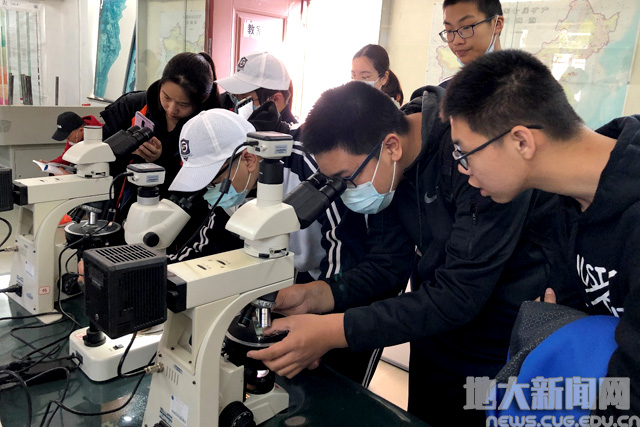 师生们在显微镜室认真观察手标本和薄片