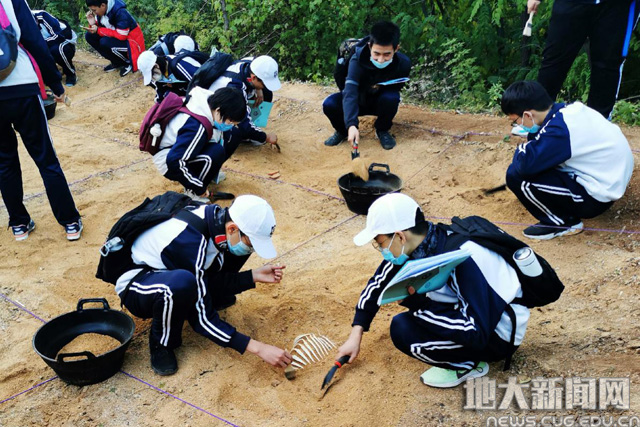 学生们在模拟考古现场细心挖掘