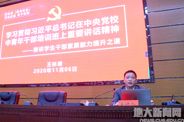 王林清以《学习贯彻习近平总书记在中央党校中青年干部培训班上重要讲话精神——兼谈学生干部素质能力提升之道》为主题,讲授专题党课。他围绕“深刻领会要义、把握精神实质;着力践行悟道、苦练能力本领;坚守纪律规矩、养成勤学习惯”三个方面,回顾习近平总书记在2020年秋季学期中央党校(国家行政学院)中青年干部培训班开班式上发表的重要讲话,指出学生骨干必须树牢信念,掌握知识,学好本领,为将来服务人民、报效祖国打好坚实基础。