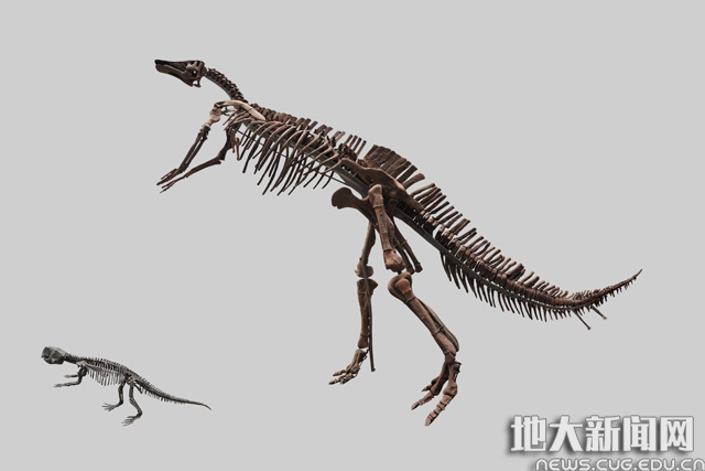 满洲龙化石(右)与鹦鹉嘴龙化石
