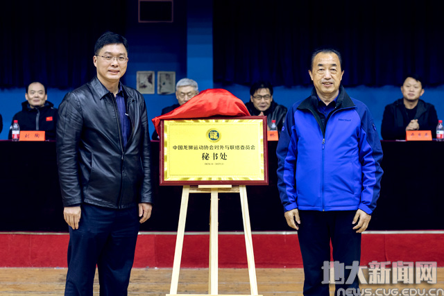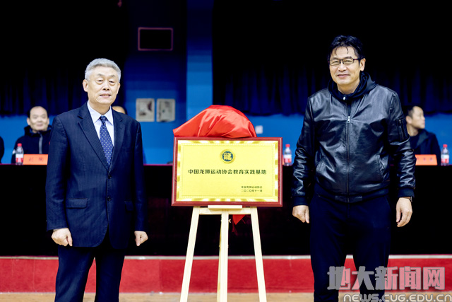 傅安洲(左)、余汉桥(右)共同为“中国龙狮运动协会教育实践基地”揭牌