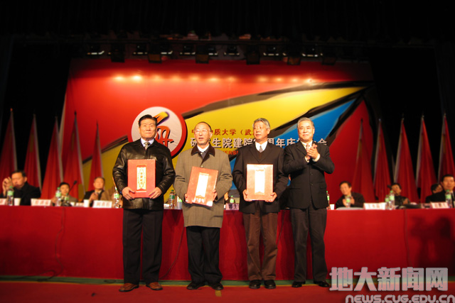 2006年,时任校长张锦高(右1)向赵鹏大、殷鸿福和金振民院士(从左至右)
