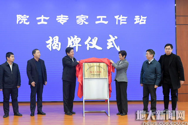 会议举行了王焰新院士专家工作站揭牌仪式。全国政协常委、中国地质调查局副局长李朋德(左三)和黄晓玫共同为院士专家工作站揭牌。湖北省科协、武汉地质调查中心、中国地质调查局科外部领导和王焰新院士见证。