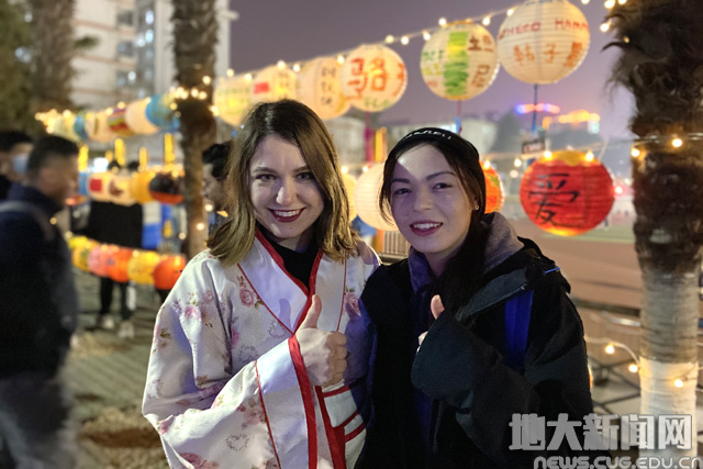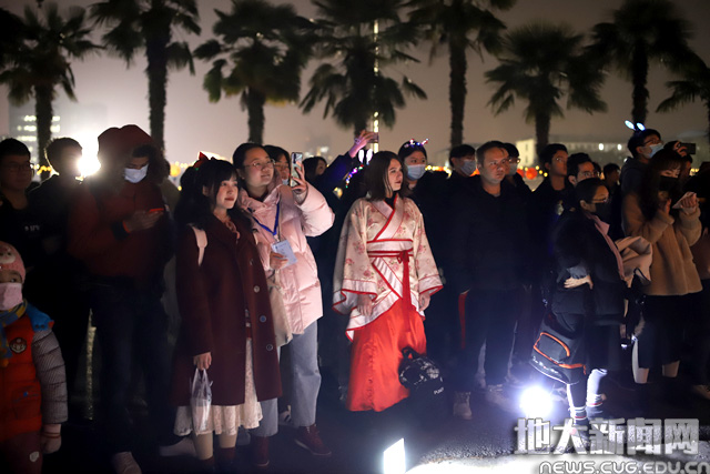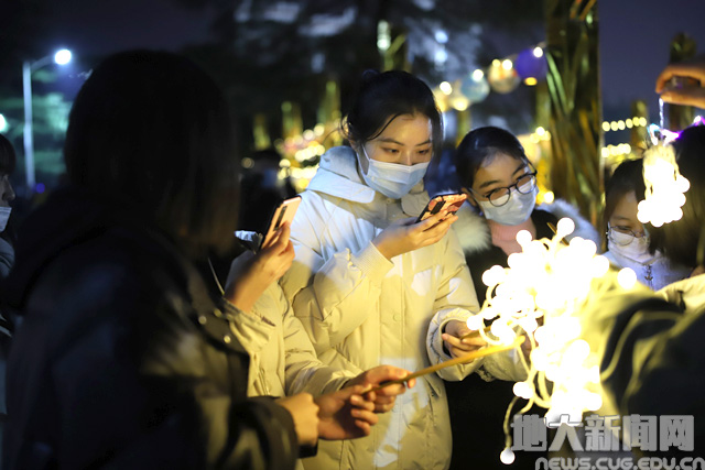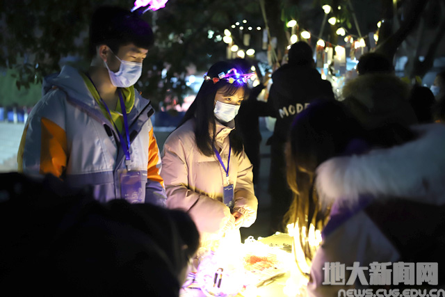 在灯会主路上,同学们还精心设计了两处许愿角,将蒲公英花束灯环绕在布满灯光的许愿树周围。师生们将自己的美好心愿写在许愿签上,挂满枝头,期盼来年得以实现。整个灯会现场其乐融融,喜乐祥和。来自学校子衿汉服社的同学们身着汉服,在主路中心翩翩起舞,或是三两好友相约一起,边看花灯边拍照,用光影留住美好时刻。