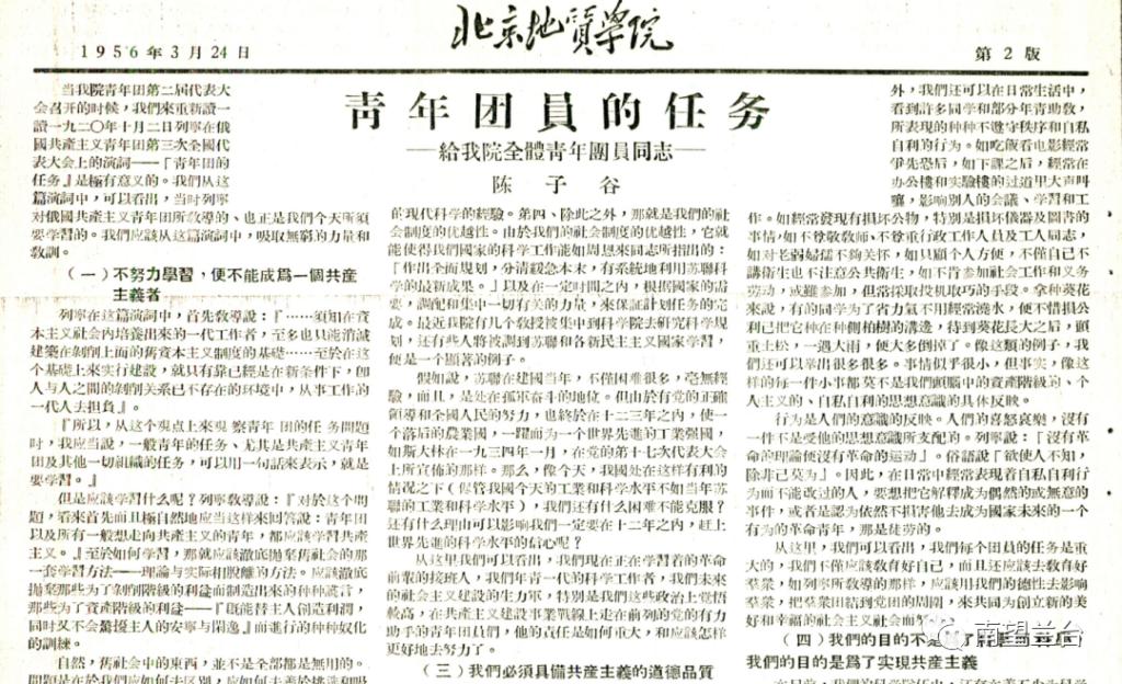 1956年,陈子谷在北京地质学院校刊发表《青年团员的任务——给我院全体青年团员同志》