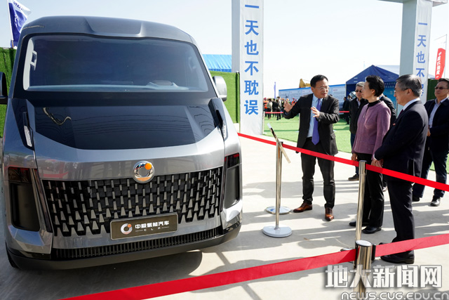 郝义国董事长(左一)向邱丽新市长(左二)王焰新校长(右一)介绍刚在上海国际车展发布的氢能物流车