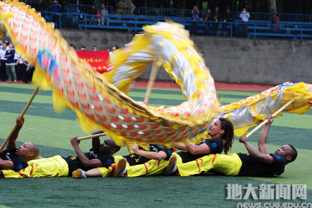 留学生正在“舞龙” 屠傲凌摄