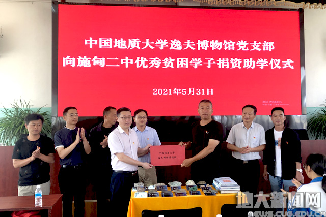 逸夫博物馆党支部书记彭磊代表博物馆党支部,向该校优秀家庭困难学生发起爱心捐助,该校党委副书记赵维胜接受捐助。