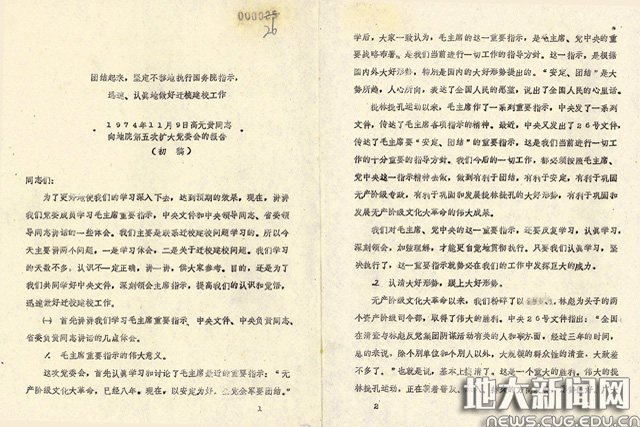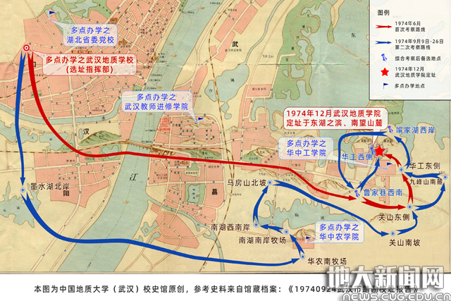 1974年6月和9月,学校临时党委专门组建了由王焕任组长、徐新甫、朱见香任副组长的校址踏勘小组,先后两次组织在武汉市内开展选址踏勘调研,最终定址于东湖之滨、南望山麓。1974年12月28日,学校更名为武汉地质学院。