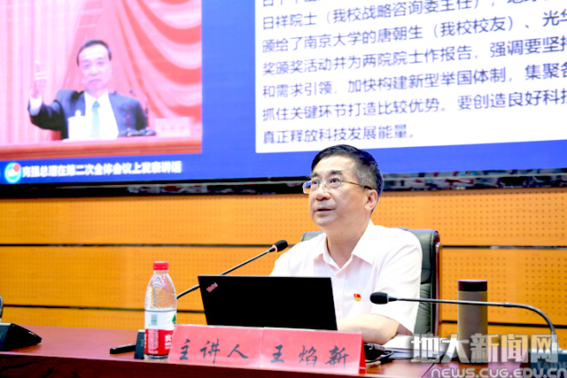 中科院院士、校长王焰新教授传达习近平总书记在全国两院院士大会讲话精神。他用扼要的文字和生动的图示,深入浅出地介绍了全国两院院士大会概况,以“一个鲜明主题、两个高度肯定、三大国家战略、四个趋势判断、五项重点任务”为切入点,全面阐述了会议精神,传达了习近平总书记对两院、科协的两点要求和对广大院士的四点希望。他表示,这次会议是在“两个一百年”奋斗目标的历史交汇点、开启全面建设社会主义现代化国家新征程的重要时刻,共商推进我国科技创新发展大计的一次盛会,会议深入剖析了新一轮科技创新发展态势,对科技工作作了全面部署,对两院院士提出了殷切期望,思想深刻、内涵丰富,为在新时代高质量推进科技工作提供了前进指南、根本遵循,作出了重要宣示、思想动员,吹响了实现高水平科技自立自强的冲锋号角。