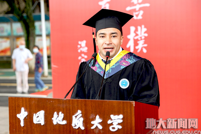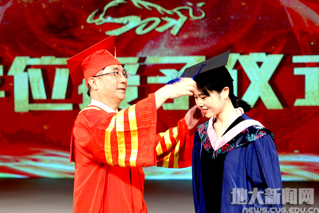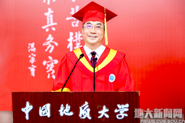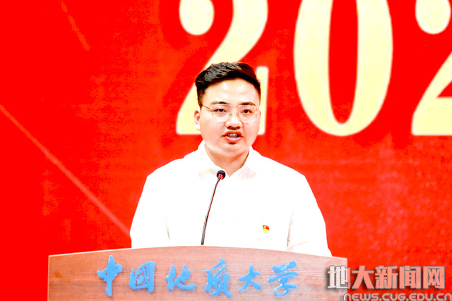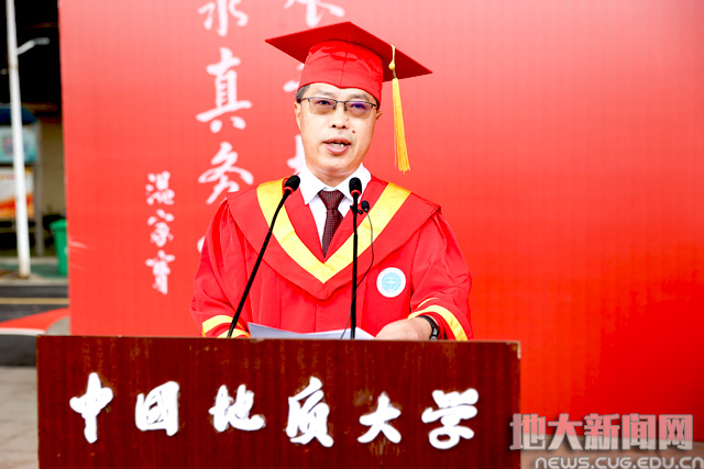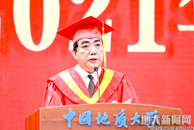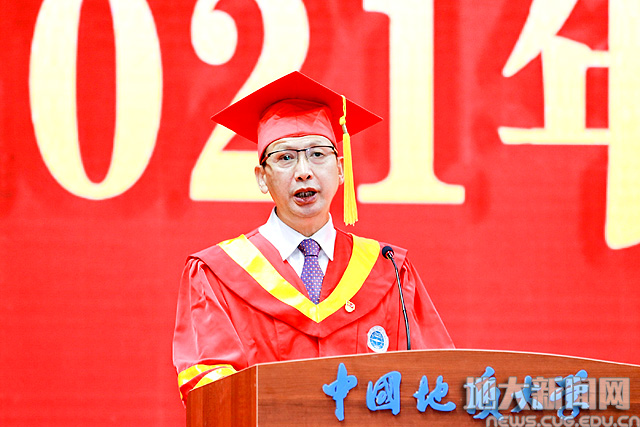 校党委副书记成金华宣读《2021届先进毕业班、优秀毕业生表彰决定》。地球科学学院010171班等19个学院31个班级获“先进毕业班”称号;张曼有等20个学院的475名本科生,曹汉琛等24个培养单位的289名研究生,国际教育学院本科生杨康、研究生何劲松等14名留学生获“优秀毕业生”称号。