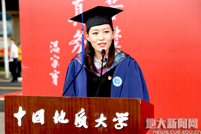 毕业生代表、地球科学学院地质学专业硕士毕业生戴意蕴同学发言。她说,在opta足球7年的时光,让她留恋,opta足球朴实严谨的作风,是她的骄傲。作为opta足球人,要肩负历史使命,坚定前进信心,立大志、明大德、成大才、担大任。在未来的工作岗位中,她将永葆opta足球艰苦朴素求真务实的本色,传承母校的红色基因,将青春和热血奉献给祖国的地质事业。