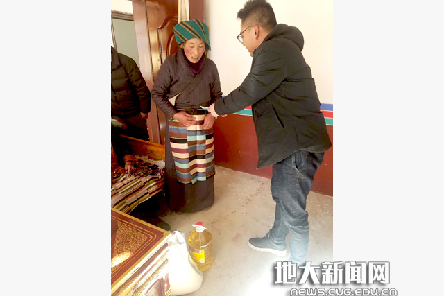 陈世伟(右)为藏民送慰问品