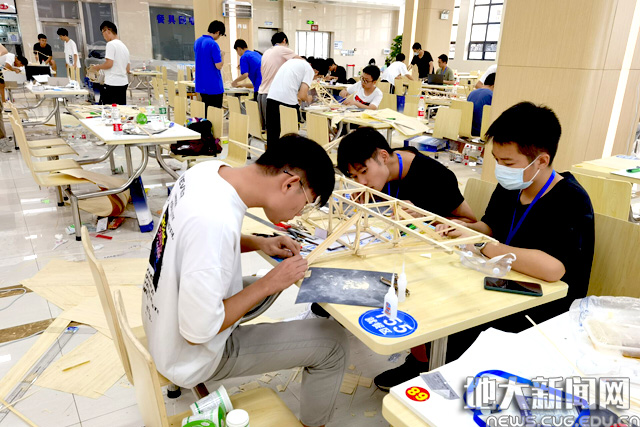 16日上午8点比赛正式开始。参赛队员需要完成现场计算、模型设计及制作等环节,比赛时间持续到17日上午11点,竞赛用于现场模型设计与制作的时间长达16.5小时。比赛现场每支队伍都保持高度集中的精神状态,每个人都在紧张的氛围中有序高效地完成自己的分工。模型制作完毕后,11位评委专家对理论计算书、模型制作打分,评选出最佳制作作品和最佳创意作品。