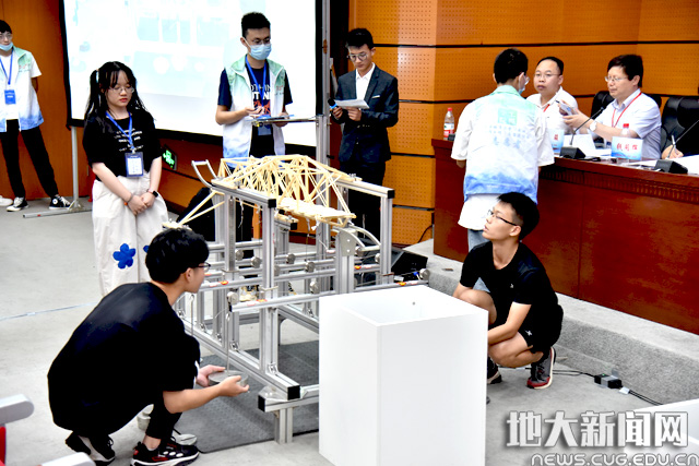 17日下午,模型加载环节正式开始。每组队员用一分钟向各位评委老师介绍本组模型的造型结构、设计理论,回答评委提问,接着通过一级、二级、三级加载,竞赛评委综合各项成绩为参赛作品打出总分。