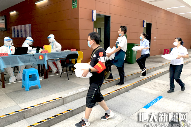 8月4日下午,武汉最高气温超过35摄氏度,学校正式开始全员核酸检测。为了给“全副武装”的医护人员防暑降温,检测点配备了电风扇5台、矿泉水50箱,饮食服务中心还提供了冰袋、冰镇酸梅汤等降温物资,为他们驱散了头顶骄阳的炙烤,送来了阵阵清凉。为满足医护及工作人员就餐需求、保证送餐质量,饮食服务中心全面细致考量餐食营养搭配、用餐安全等,累计配送盒饭套餐、水果拼盘、爱心汤羹530余份。