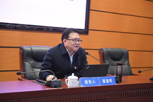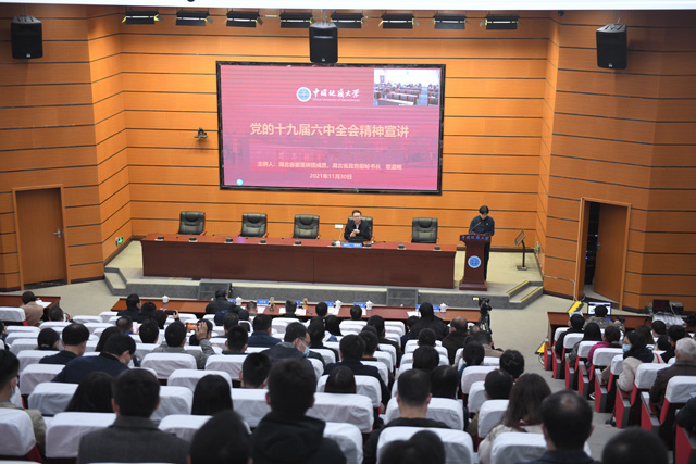 校党委书记黄晓玫表示,覃道明秘书长的报告主题鲜明、内容丰富,既有很强的历史纵深感又关照我们当前所处的现实环境,对我们理解和把握十九届六中全会精神有极大的启发作用,激励我们以“伟大的历史主动精神”,更加自觉地团结在以习近平同志为核心的党中央周围,不忘昨天的苦难辉煌,无愧今天的使命担当,不负明天的伟大梦想,在新时代新征程中赢得更加伟大的胜利和荣光。她要求,全校上下要把学习贯彻全会精神与党史学习教育相结合,与巡视整改相结合,与巩固深化“不忘初心、牢记使命”主题教育成果相结合,与完成今年年度重点工作和谋划明年工作相结合,鼓舞全体师生员工落实立德树人根本任务,推动学校事业高质量发展,奋力建设地球科学领域国际知名研究型大学,以优异成绩迎接党的二十大胜利召开。各二级党组织要担起政治责任、落实主体责任,对照学校和上级文件要求制定具有本单位特色的六中全会学习方案,精心组织学习培训、有效开展分类宣讲,确保理论学习全覆盖。师生党支部要按照“七个有力”要求,充分发挥党支部的战斗堡垒作用,开展形式多样的学习教育活动,及时把学习成效转化为组织成效、政治成效,迅速在全校师生中掀起学习宣传全会精神的高潮。思想政治理论课教师要深化理论研究阐释,通过集体备课、研学等方式指导专业教师将六中全会精神有机融入教育教学,实现思政课程与课程思政深度融合,促进六中全会精神进课堂、进教材、进头脑。