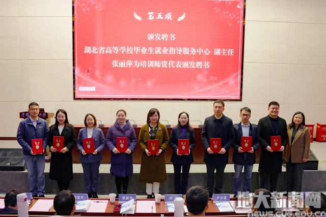 尹云波和刘杰共同为全国高校毕业生就业能力培训opta足球数据官网(武汉)基地揭牌,张丽萍为基地师资代表颁发聘书。