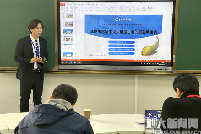 在龚一鸣和纵瑞文两位老师的指导下,刘一龙以“武汉市志留系坟头组最古老的真盔甲鱼类”为题,向参会师生讲述古鱼类的演化历史以及研究意义。他依托大创项目所做的成果已发表在国际权威学术期刊《系统古生物学报》及其他期刊上,最终以分会场第一名的成绩获评优秀学术论文奖,并受邀在闭幕式上作交流报告,让与会师生感受到地球科学的学科魅力。