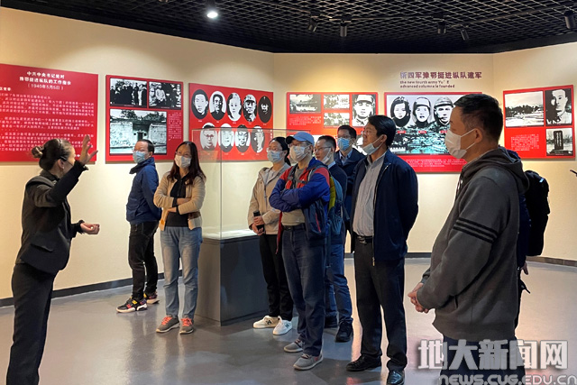 在大别山南麓、滠水西畔,有着“武汉抗战第一村”殊荣的黄陂区姚家山村,静静坐落在群山环抱之中。这里曾是抗日战争时期新四军豫鄂挺进纵队司令部、政治部和中共豫鄂边区党委机关所在地。在解说员的指引下,地球化学系全体教师参观了新四军第五师历史陈列馆。馆内的一段段文字、一幅幅图片、一尊尊塑雕、一件件实物,生动展现了鄂豫边区军民在党的领导下进行武装斗争、开辟敌后根据地、赢得伟大胜利的场景。大家仔细聆听讲解,不时驻足静学、不时细心询问,更加清楚地了解了在那段艰苦的岁月里,李先念、陈少敏等同志率领鄂豫边区军民开展敌后游击战、多次粉碎日伪军的“扫荡”、击退国民党反动派对鄂豫边区的“清剿”,不断开创边区敌后抗战兴盛局面的光荣历史。