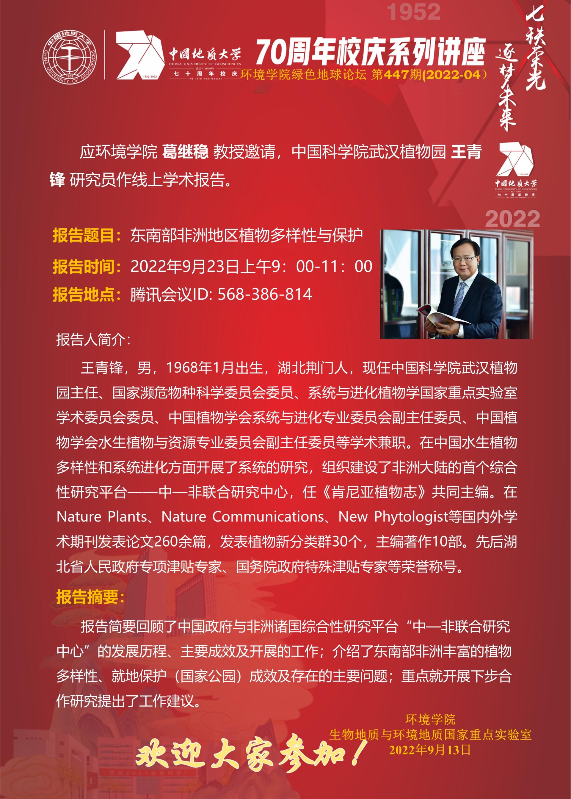 【9月23日】绿色地球论坛:中国科学院武汉植物园王青锋研究员学术报告