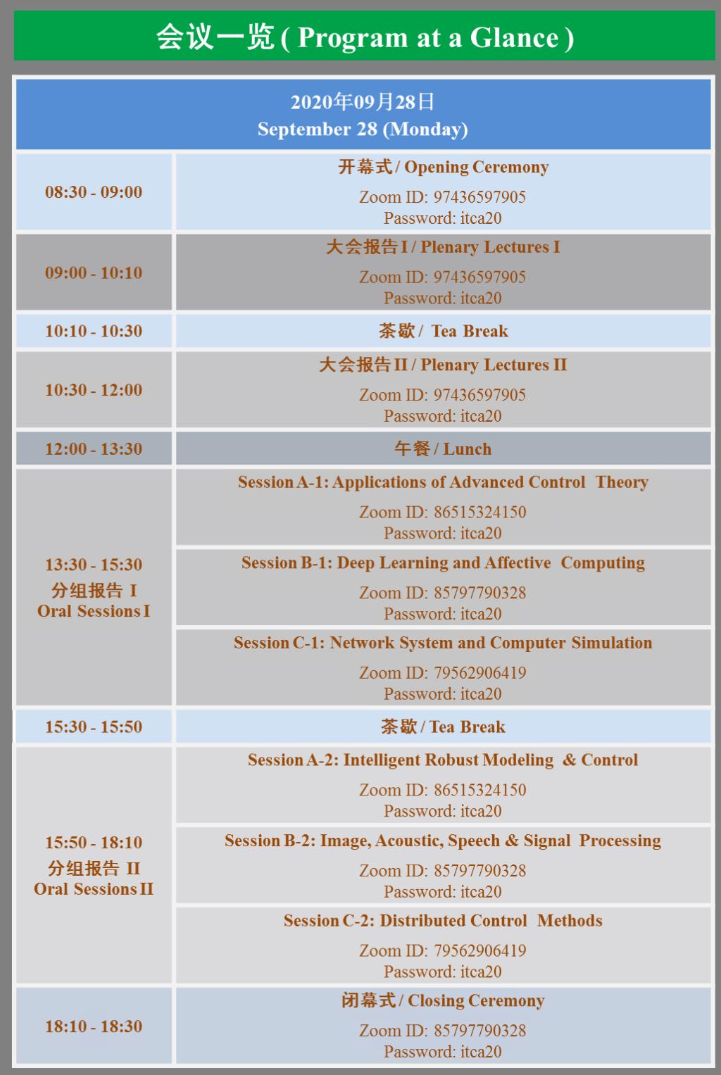 第13届中日信息技术与控制应用国际研讨会(ITCA2020)由opta足球数据官网(武汉)、湖北民族大学承办,将于2020年9月28日以Zoom线上会议形式举行。会议日程及Zoom ID信息如下: