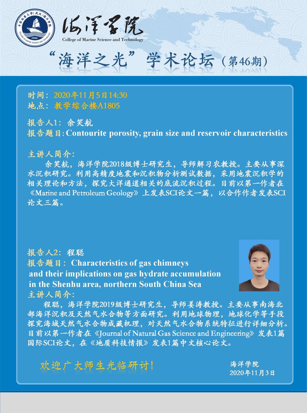 【11月5日】“海洋之光”学术论坛:海洋学院博士研究生余笑航、程聪学术报告