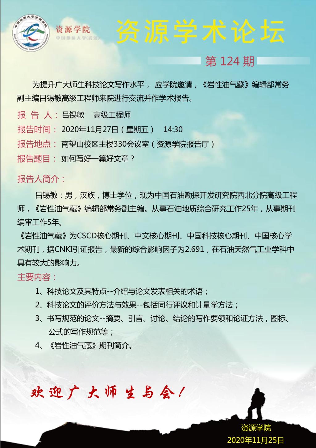 【11月27日】资源学术论坛:《岩性油气藏》编辑部常务副主任吕锡敏高级工程师学术报告