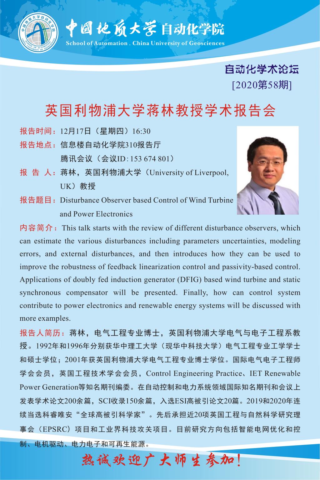 【12月17日】自动化学术论坛:英国利物浦大学蒋林教授学术报告