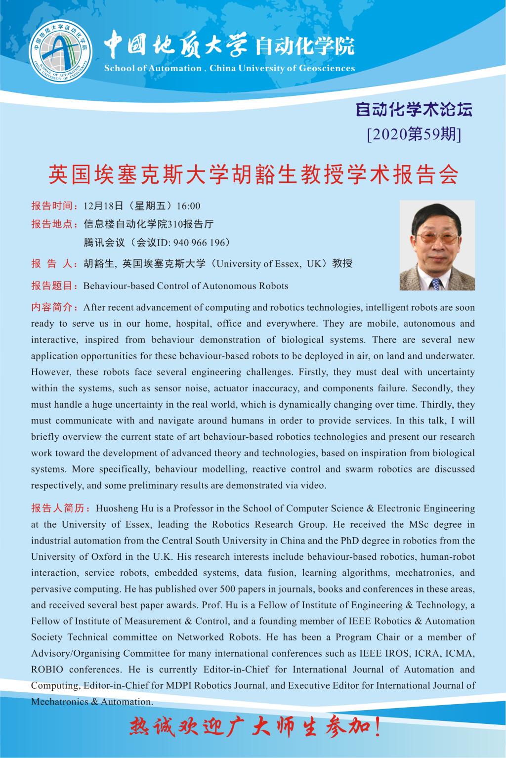 【12月18日】自动化学术论坛:英国埃塞克斯大学胡豁生教授学术报告