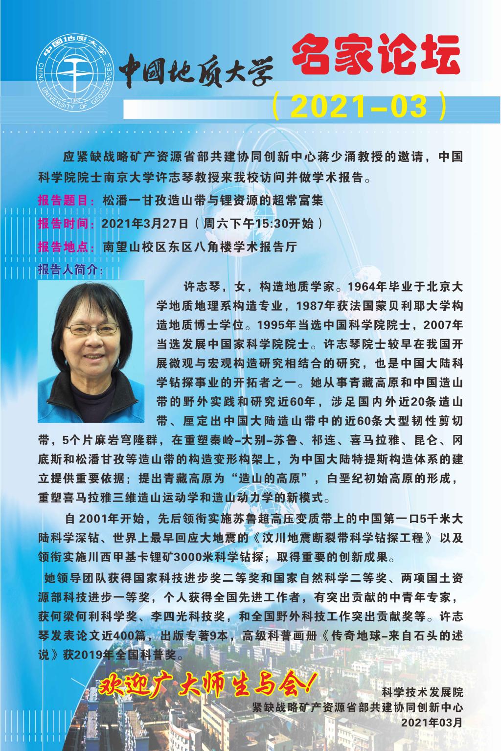 【3月27日】名家论坛:中国科学院院士南京大学许志琴教授学术报告