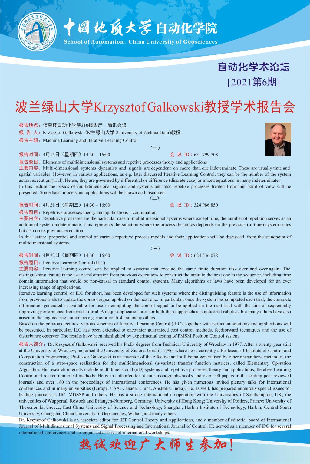 【4月15-22日】自动化学术论坛:波兰绿山大学Krzysztof Galkowski教授学术报告