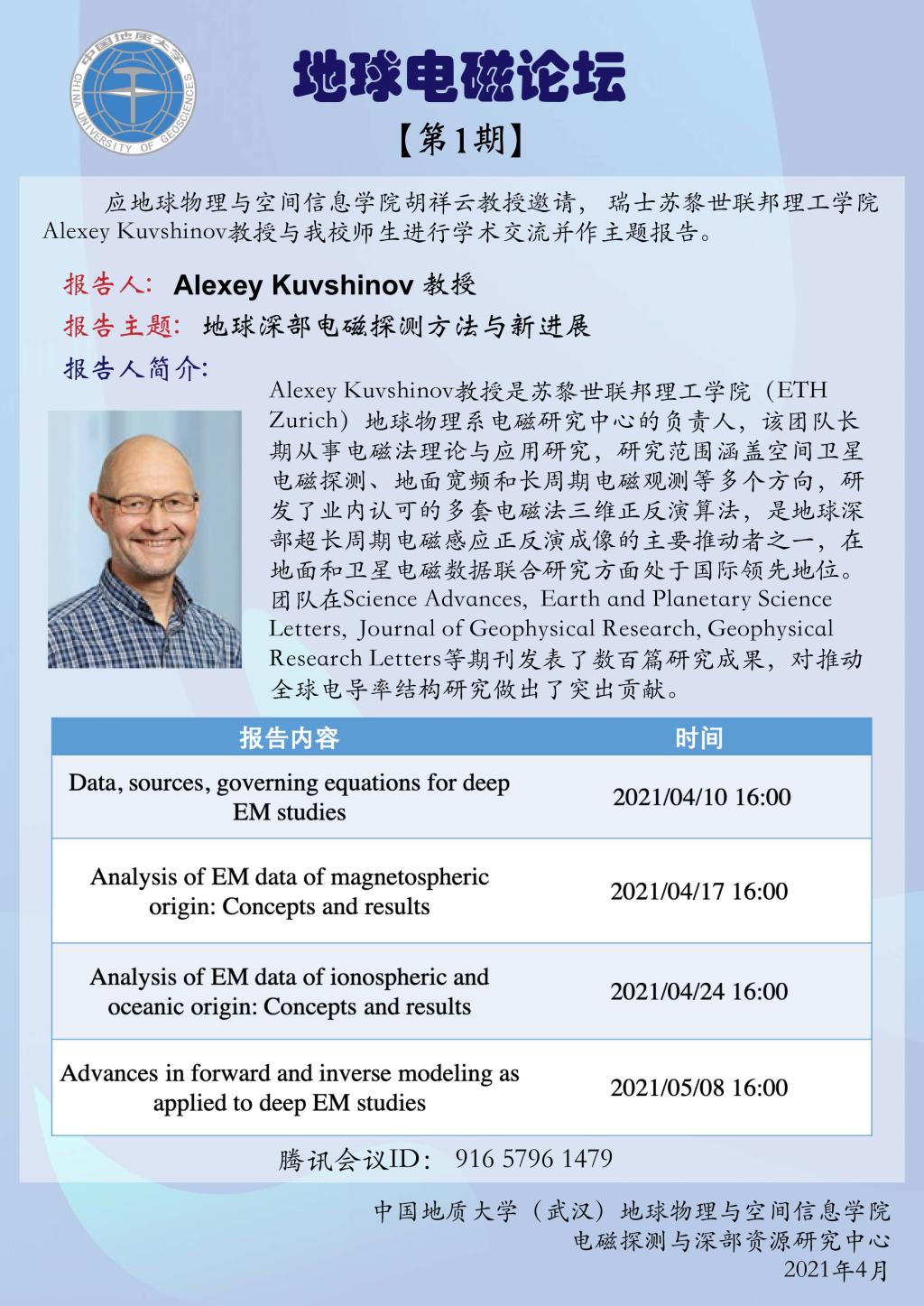 【4月10日-5月8日】地球电磁论坛:瑞士苏黎世联邦理工学院Alexey Kuvshinov教授学术报告