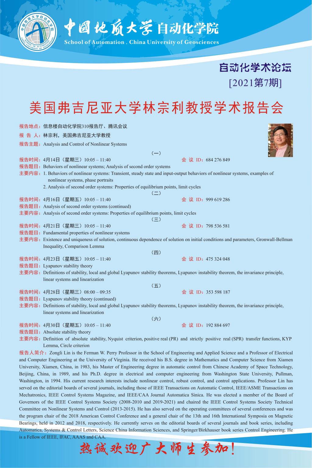 【4月14-30日】自动化学术论坛:美国弗吉尼亚大学林宗利教授学术报告