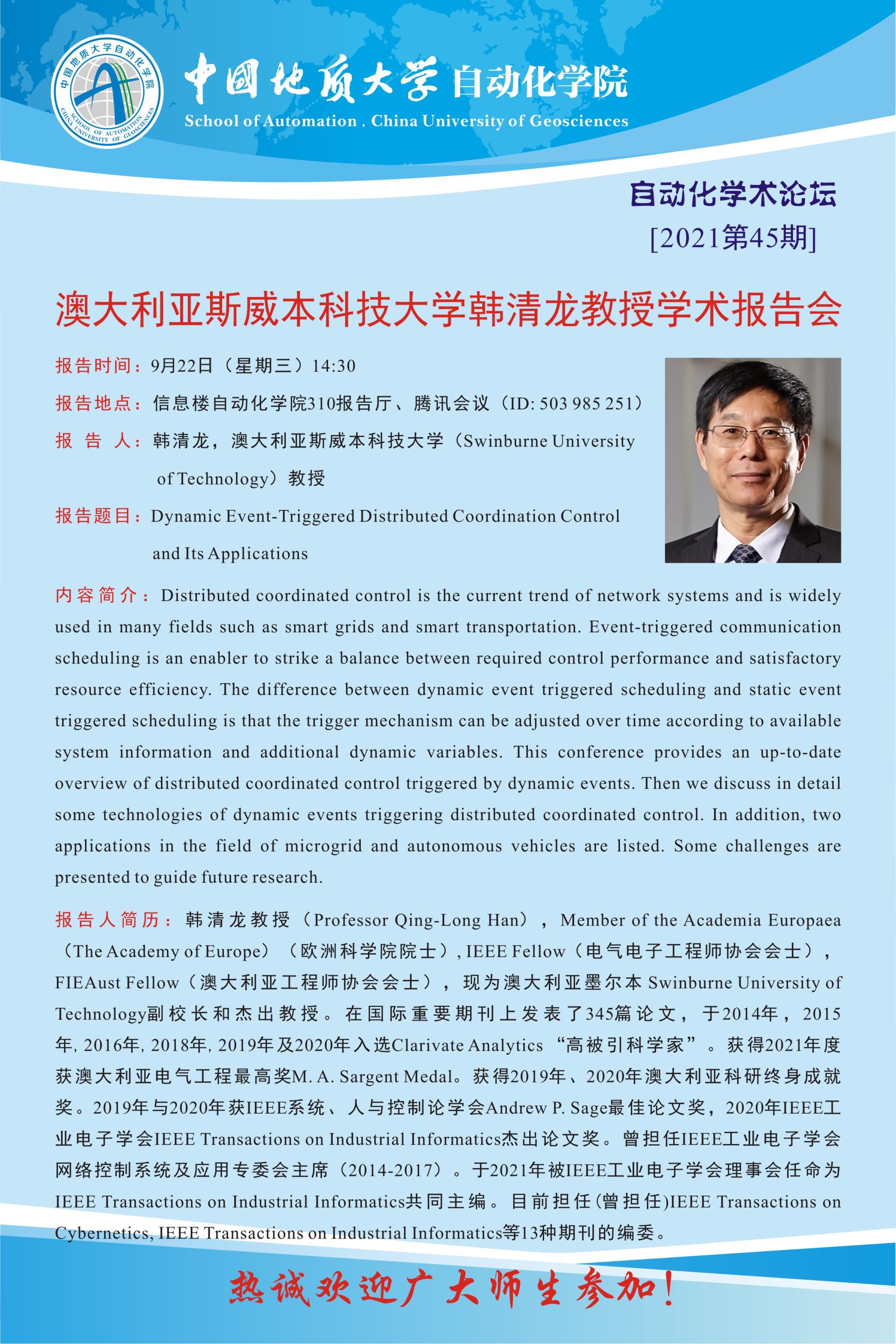 【9月22日】自动化学术论坛:澳大利亚斯威本科技大学韩清龙教授学术报告