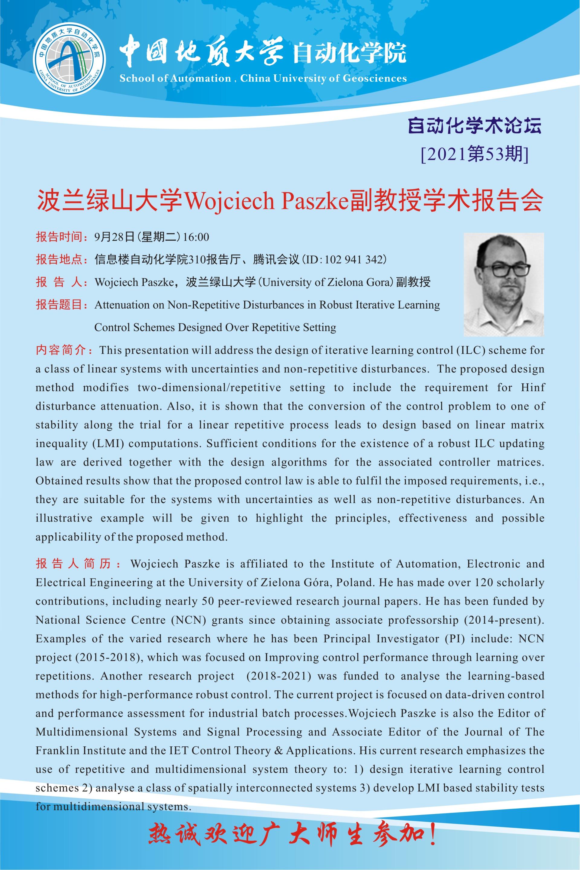 【9月28日】自动化学术论坛:波兰绿山大学Wojciech Paszke副教授学术报告