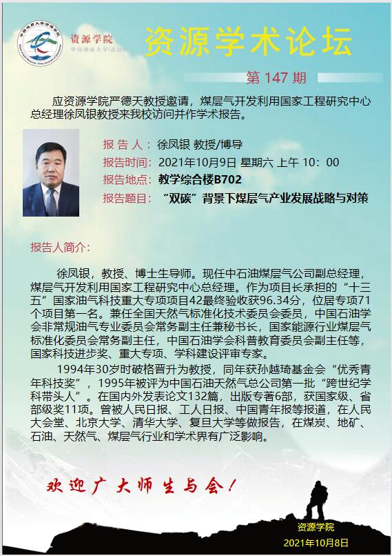 【10月9日】资源学术论坛:煤层气开发利用国家工程研究中心总经理徐凤银教授学术报告
